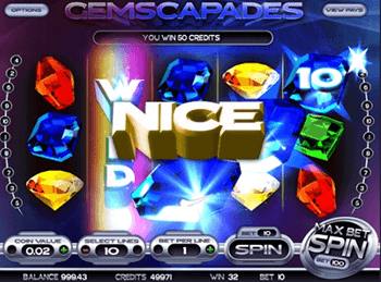 Игровой автомат Gemscapades впечатлит разнообразием желанных камней и шансов получить выплаты за них. Помимо самоцветов цепочки формируют также символы семерки и bar. Они принесут наибольшую выплату – до 120 и 250 кредитов соответственно. Добавляет интерес тот факт, что призовые комбинации формируются с обеих сторон игрового поля. Особым элементом игры стал Вайлд в виде цветка из драгоценных камней. Он не только заменит любые символы, но и активирует один бесплатный спин.