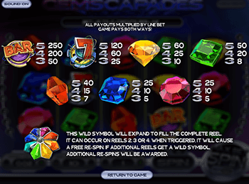 Игровой автомат Gemscapades впечатлит разнообразием желанных камней и шансов получить выплаты за них. Помимо самоцветов цепочки формируют также символы семерки и bar. Они принесут наибольшую выплату – до 120 и 250 кредитов соответственно. Добавляет интерес тот факт, что призовые комбинации формируются с обеих сторон игрового поля. Особым элементом игры стал Вайлд в виде цветка из драгоценных камней. Он не только заменит любые символы, но и активирует один бесплатный спин.